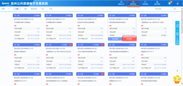 1、请登录克州电子交易平台会员端,在【我的项目】中找到对应项目,点击【项目流程】,进入项目流程页面。如图: