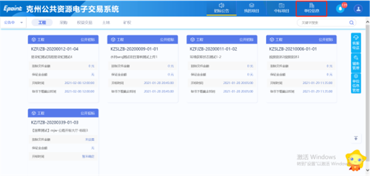 1、请登录克州公共资源交易平台会员端,点击【单位信息】进入诚信库。如图: