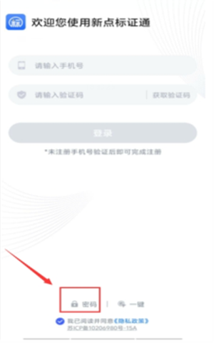 初次使用新点标证通的用户,打开APP后输入手机号,点击【获取验证码】,输入正确的验证码,验证成功后即可完成注册,登录新点标证通。如图: