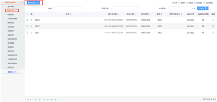 2、点击【投标人信息管理】—【职业人员】,查询是否已录入人员。如未录入人员,请录入后再进行挑选。如图: